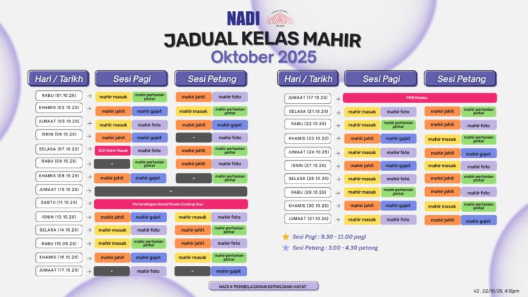 â 17 Okt: Kelas Masak & Jahit tiada kerana Cikgu Masak & Jahit terlibat PMR Melaka. Ada SLS Mahir Masak Live dari PMR Melaka (tbc). Kelas Foto & B.gajet berjalan seperti biasa.