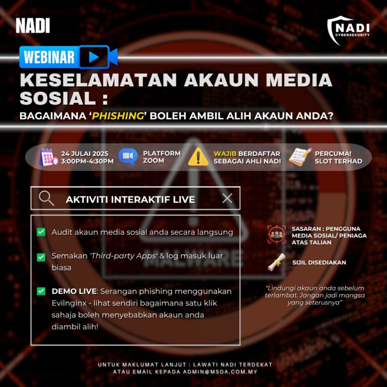 Bagaimana ‘Phishing’ Boleh Ambil Alih Akaun Anda? 📅 24 Julai 2025 (Khamis)🕒 3:00 PM – 4:30 PM💻 Platform: Zoom 📌 Apa yang akan dipelajari?✅ Audit akaun media sosial secara langsung✅ Semakan Third-party Apps & log masuk luar biasa✅ DEMO LIVE: […]