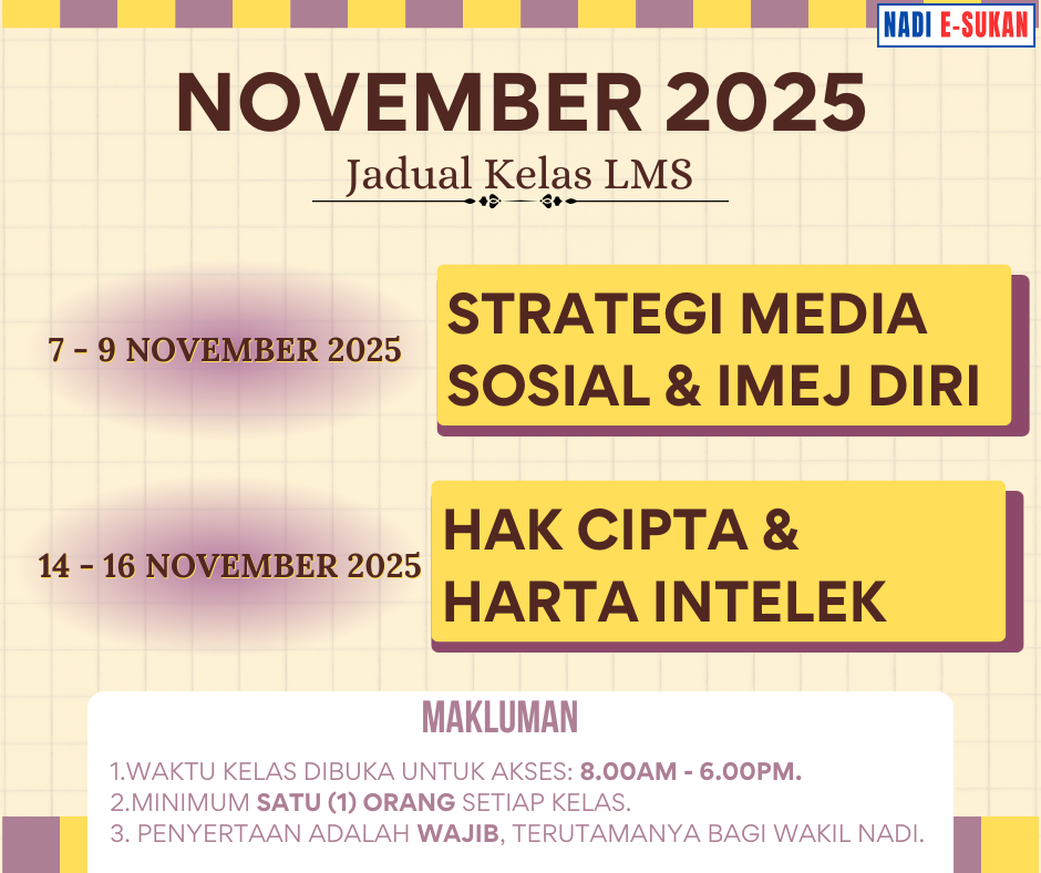 Pihak kami ingin memaklumkan bahawa Pertandingan Mencipta E-Poster NADI akan berlangsung dari 1 hingga 30 November 2025. Semua ahli NADI di bawah negeri terlibat dijemput untuk menyertai pertandingan ini. Tema Poster: Syarat Penyertaan: Hadiah: Penyertaan:Peserta boleh menyertai pertandingan mengikut kategori […]